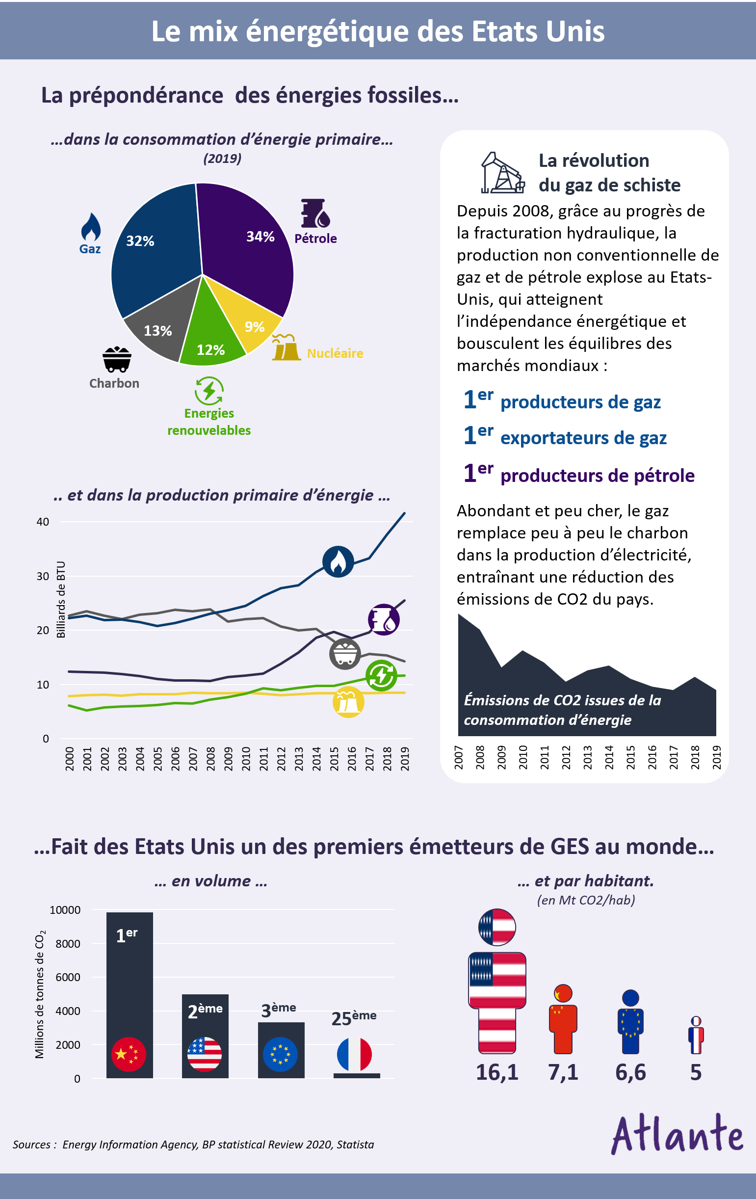 Historiquement un des premiers émetteurs mondiaux de gaz à effet de serre (GES) [1] , et rétifs à tout engagement contraignant de réduction d’émissions, les Etats-Unis n’ont commencé à engager des efforts sérieux de lutte contre le changement climatique que sous l’administration Obama. L’administration Trump a ensuite fait de son mieux pour renverser la vapeur : sortie de l’accord de Paris sur le climat, affaiblissement des normes environnementales [2] , approbation du projet de pipeline géant Keystone XL… Rien d’étonnant, donc, à ce que Joe Biden hérite d’un mix énergétique très carboné.