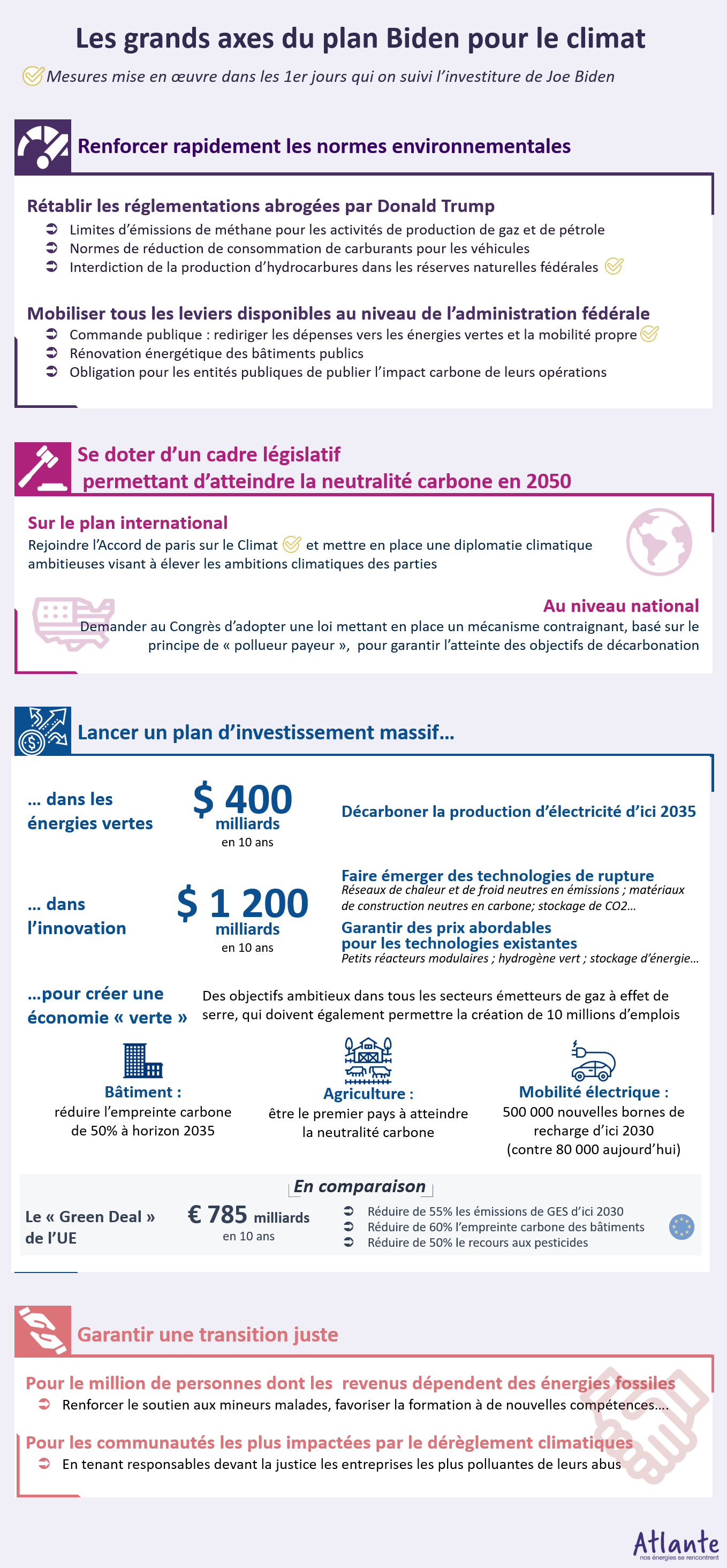 Mis au regard de la forte dépendance de l’économie américaine aux énergies fossiles, les objectifs affichés par Joe Biden paraissent d’autant plus ambitieux : neutralité carbone à l’horizon 2050 avec notamment la décarbonation totale de la production d’électricité d’ici 2035. Le projet de campagne de Biden prévoit plusieurs grands axes d’action pour atteindre ces cibles. Certaines mesures ont été mises en œuvre dans les jours qui ont suivi l’arrivée du nouveau président au Bureau Ovale.